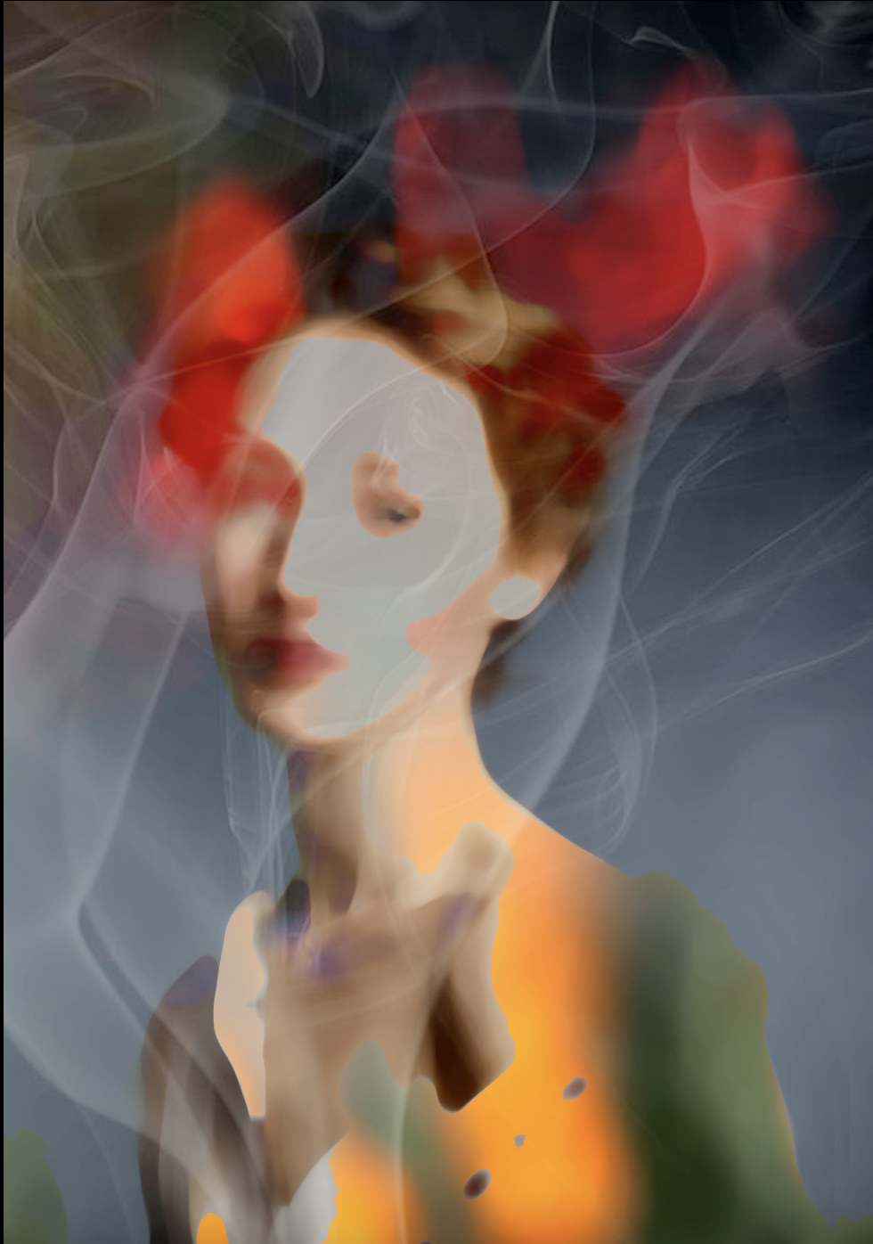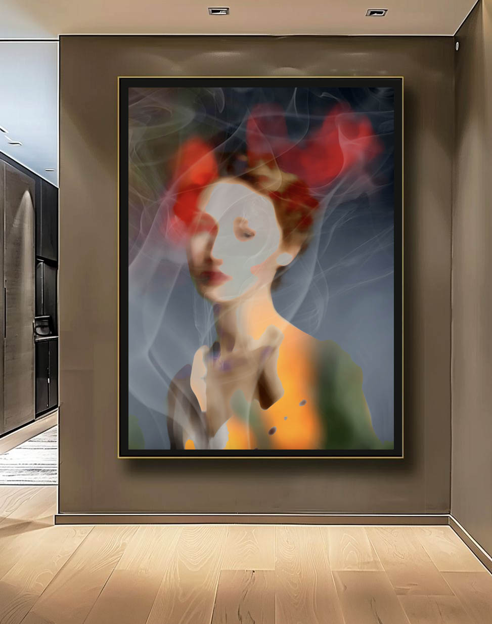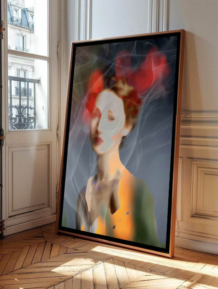 En kvinne trer frem fra et slør av røyk – stille, men samtidig intens. De grå tonene danner et drømmende bakteppe, mens glimt av rødoransje bryter gjennom som gnister av følelser og liv. Verket balanserer mellom det flyktige og det tidløse, mellom skygge og ild, og inviterer betrakteren inn i et øyeblikk der alt synes å oppløses – bortsett fra tilstedeværelsen av henne.